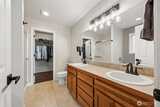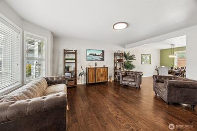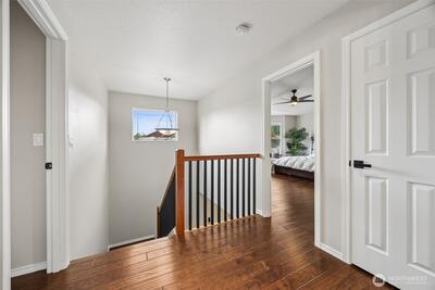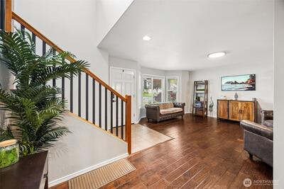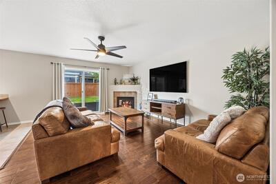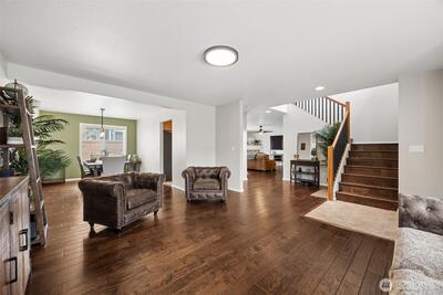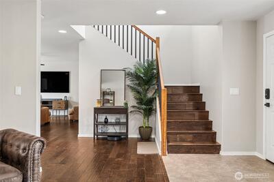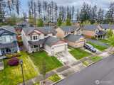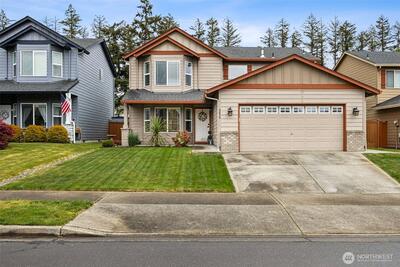 Welcome to this beautifully upgraded former model home in the sought-after Meridian Campus at Hawks Prairie! Four spacious bedrooms with 2220 Square feet of space. Enjoy stunning engineered hardwood flooring throughout both levels, adding warmth and elegance to every room. The vaulted stairway with open rail accents creates a spacious feel. The main floor offers a versatile formal living space alongside a dining area or home office—perfect for today’s lifestyle. The kitchen is both stylish and functional, featuring tile flooring, rich cherry cabinetry, stainless steel appliances, and a breakfast bar that opens to a cozy family room with a gas fireplace. Upstairs, all four bedrooms provide comfort and privacy, including a spacious primary suite with vaulted ceilings, a luxurious 5-piece bath with soaking tub, and a walk-in closet. Step outside to a fully fenced backyard with a patio for relaxing or entertaining. An irrigation system covers your front and back yard space for conve