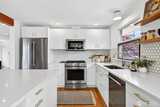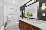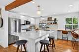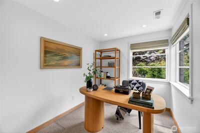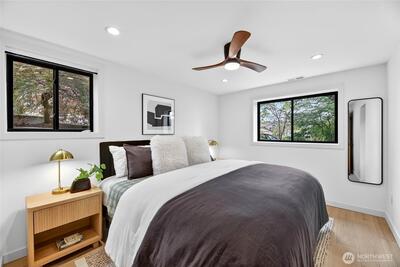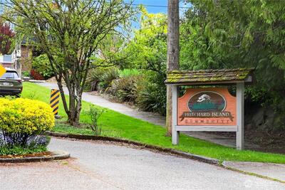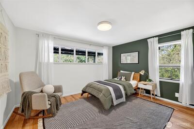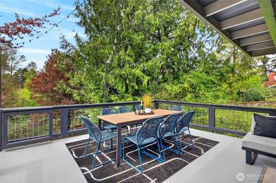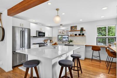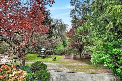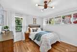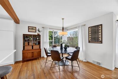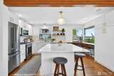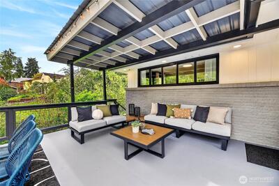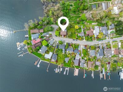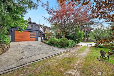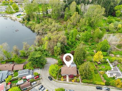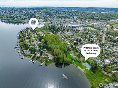 Tucked into the unique and highly sought-after enclave of Pritchard Island, this beautifully remodeled midcentury home offers an exceptional blend of privacy, natural surroundings, and proximity to Lake Washington. Originally built in 1948 and thoughtfully updated, the spacious 2,610 sq ft layout features 4 bedrooms plus an office and 2 updated bathrooms. The light-filled main level showcases an open kitchen with peek lake views, seamlessly connecting to the dining and living areas, anchored by a cozy gas fireplace and designed for easy everyday living and entertaining. Step out to the large, partially covered deck and take in tranquil views of the Seattle Parks Urban Farm and lush greenbelt - an incredibly peaceful backdrop. The lower level offers a generous family room with wood-burning fireplace, two additional bedrooms, a private office overlooking the backyard, a bonus room, and a dedicated laundry room. Situated on a 6,409 sq ft corner lot on a quiet dead-end street, the home als