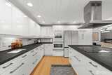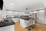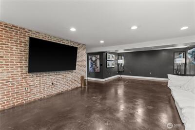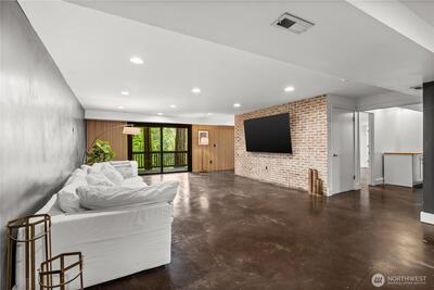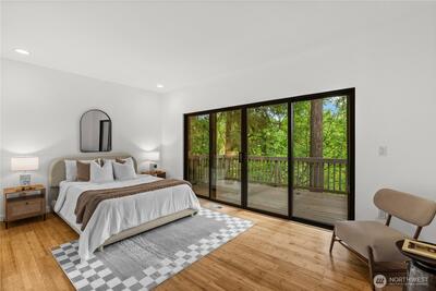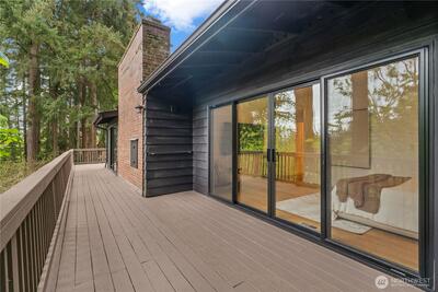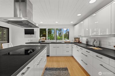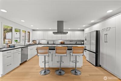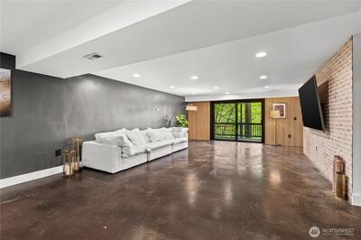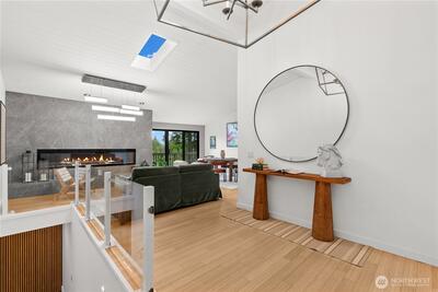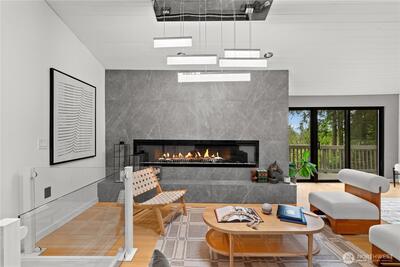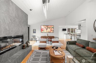 Exceptionally maintained and extensively upgraded, this Edgewood retreat sits on a shy half-acre double lot, surrounded by mature trees for privacy and a true Pacific Northwest feel. Flooded with natural light, the home showcases soaring vaulted shiplap ceilings, skylights, and warm bamboo flooring throughout the main living areas. A stunning floor-to-ceiling marble gas fireplace anchors the open-concept living and dining space, creating an inviting atmosphere for both everyday living and entertaining.The chef’s kitchen is designed for function and scale, featuring a massive island, dual sinks, double wall ovens, induction cooktop, concrete countertops, and abundant storage. The primary suite offers direct access to a wraparound deck through brand new vinyl sliders, creating a seamless indoor-outdoor experience, along with a spacious walk-in closet and private en-suite bath.The lower level provides incredible flexibility with a large rec room, second fireplace, polished concrete floo