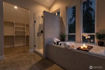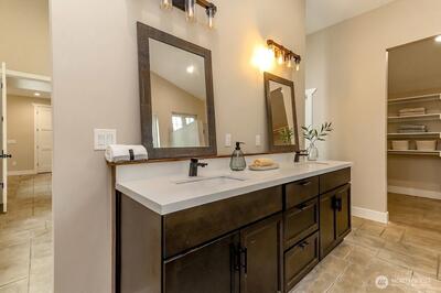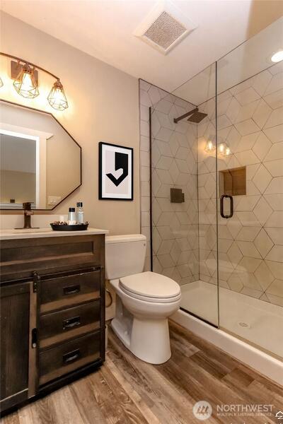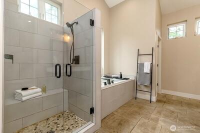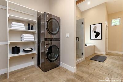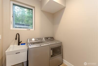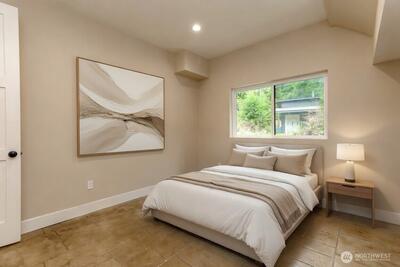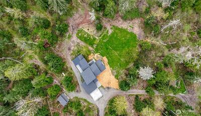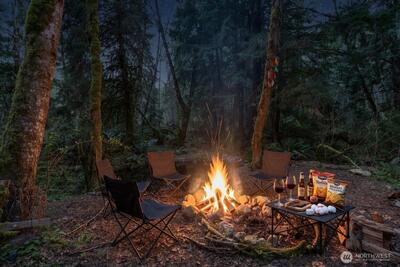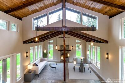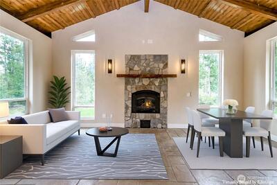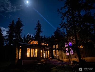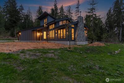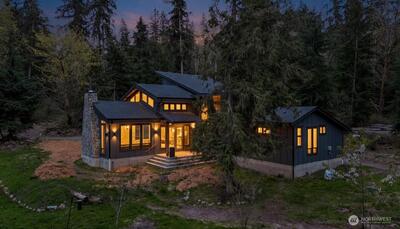 Welcome to this exceptional 2021 custom-built NW Contemporary estate on 20 ac w/ South Prairie Creek frontage. Offering 3,258 sq ft, this thoughtfully designed home features 2 bdrms, 3 bths, flex space w/ built-in desk, ideal for home office or gaming. 5-bdrm septic design offers future expansion potential. The great rm & kitchen showcase soaring cathedral ceiling w/ exposed tongue-and-groove cedar, creating a warm yet dramatic living space. Custom stamped concrete floors w/ radiant heat runs throughout the main level. Chef’s kitchen is anchored by a 48" ZLINE propane range, complemented by butcher block counters & spacious island, perfect for entertaining. Primary suite offers a huge walk-in closet w/ stackable W/D, jetted soaking tub, & large walk-in shower, your private retreat. Laundry rm includes utility sink & side-by-side W/D. Upstairs features 3/4 bth & expansive loft, ideal for media, theater, music, hobby, or fitness space. Additional features include home sprinkler system,