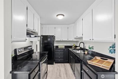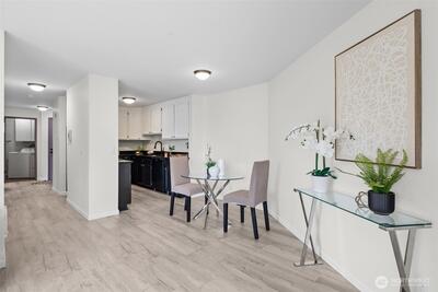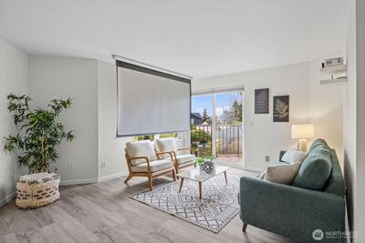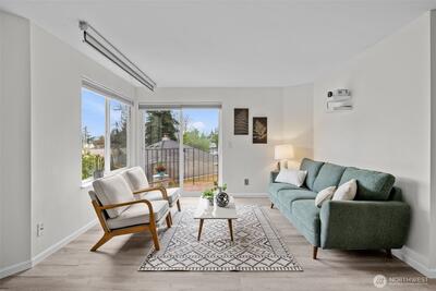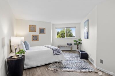 Self managed HOA at Viewland Heights keeps the building in great shape while keeping dues reasonable. Brand new elevator installed recently. This unit has zero steps to enter. Tandem 2 car parking space is closest to the main entrance and unit is just around the corner. NO STAIRS, but deck side of the unit is not ground level, which is why you get the amazing territorial & sunset views! Best of both worlds. Unique layout in this unit keeps it feeling like a home...not at all cookie cutter. Note: Bonus...the home theatre set up conveys with the condo! Fresh paint and brand new luxury vinyl plank installed. Kitchen and bath have been updated and all appliances stay. Private laundry room in unit! HUGE bedroom w/open concept closet space is wonderful with a large window facing west...spectacular sunset view. The main stage is on the darling deck space. Wide open westerly views show off the tree canopies and priceless sunset skyline. Located nearly equidistance from Ballard, Greenwood AND