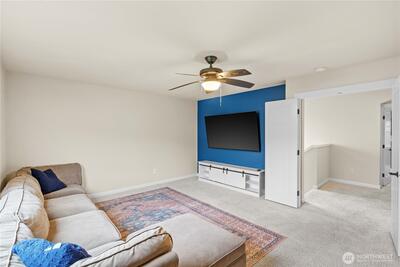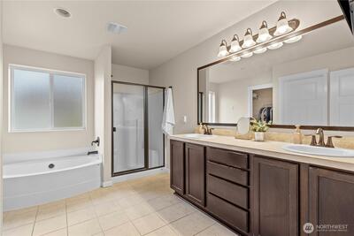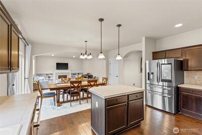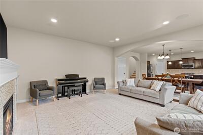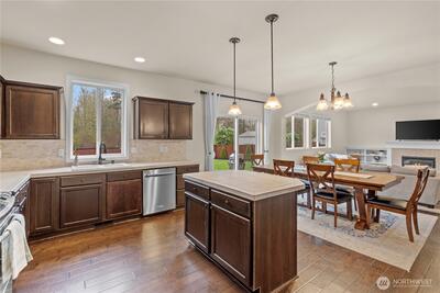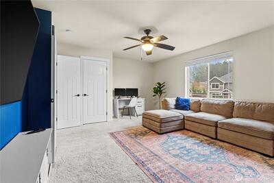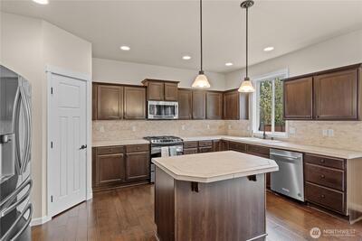 Welcome to your Grand Firs, five-bedroom, three-car garage home, located in a gated community with a neighborhood offering three parks, trails, and more. Drive up to your oversized driveway and step inside to your welcoming entrance hall. Walk into our open great room featuring a sizable living room with a gas fireplace and custom built-in storage, dining area and grand kitchen with a spacious island with bar seating, stainless steel appliances, and a convenient walk-in pantry. Right off your great room provides quick access to your fully fenced backyard with room for all and the perfect backyard BBQ space for this upcoming Summer. Before heading upstairs, check out the office on the main floor, allowing privacy and a quiet space for those who work from home. Upstairs offers a total of five bedrooms including a large primary suite with a five-piece primary bathroom including a jetted tub and a walk-in closet with built-in shelving. The utility room is also conveniently placed upstairs