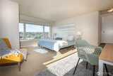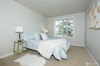 Upper-floor SW-facing corner condo with stunning Elliott Bay views. Enjoy unobstructed views from the covered south-facing deck, living area, and both bedrooms. Open living and dining spaces feature Brazilian hardwood floors and a fireplace. Modern open kitchen with cherry cabinets and slab granite counters. Oversized primary suite easily accommodates a king-size bed and features a second fireplace, private bath with dual sinks, and generous closet storage. In-unit washer/dryer, same-floor storage room, garage storage, and secure parking. Amenities include a seasonal pool (open to guests), cabana lounge with sauna and pool table, ample guest parking, pet-friendly building, and a well-managed HOA. VA FHA approved. Close to shopping and golf.