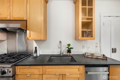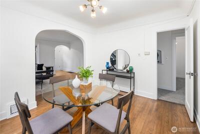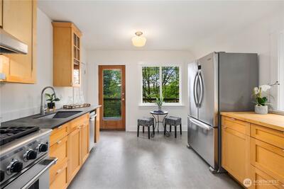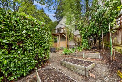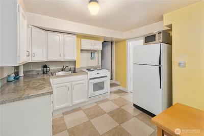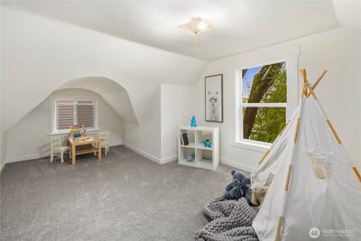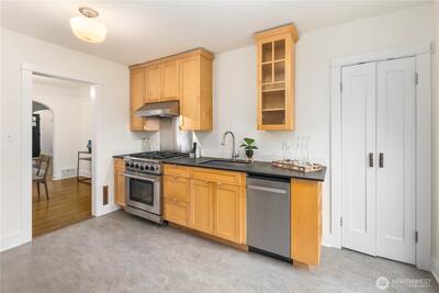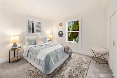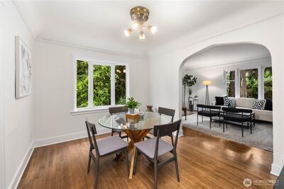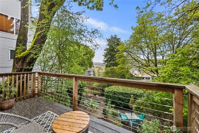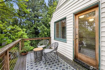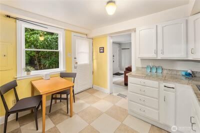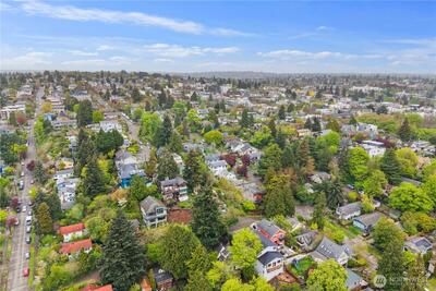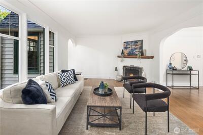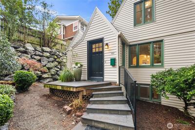 Nestled in the heart of Fremont, this storybook Tudor is a true hidden gem. Surrounded by lush greenery on a generous 7,200 sqft lot, the home lives like a private oasis, with picturesque windows framing natural light and serene views throughout. Enjoy the city skyline and a stunning view of Mt. Rainier from the kitchen window and back deck—an everyday reminder of the PNW’s beauty. This 5-bedroom, 2-bath residence is rich with preserved charm, blending timeless character with thoughtful functionality. A separate ADU offers flexibility for multigenerational living, guest accommodations, or income-producing potential—with a history of strong short-term rental performance.Step outside and into one of Seattle’s most vibrant, walkable neighborhoods—cafés, shops, parks, entertainment and the Burke-Gilman Trail are all just moments away, making it easy to live actively and stay connected to the outdoors. Located near highly rated schools and in Fremont’s iconic “Center of the U