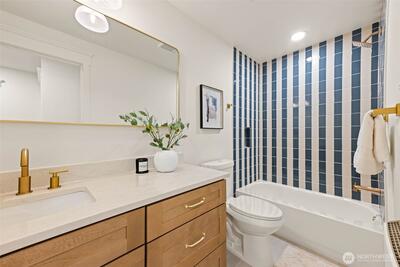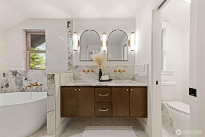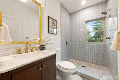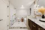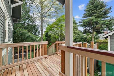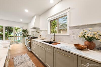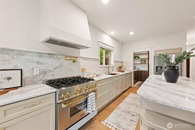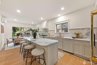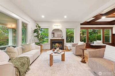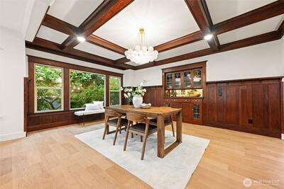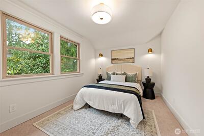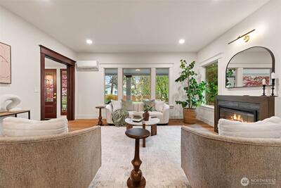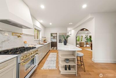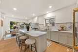 Stunning Loyal Heights Craftsman, thoughtfully reimagined w thorough permitted modern updates while preserving its inherent 1915 charm. Perched above the street, this home makes a striking first impression w an expansive front porch opening to a beautifully curated interior. The formal living room, anchored by a timeless brass fireplace, flows seamlessly into an impressive dining room wrapped in rich, refurbished wood wainscoting, original built-ins & coffered ceilings are elevated by designer lighting. The kitchen is equally captivating, blending function & style w chef-ready appliances, a generous island w softened edges & natural stone counters, a to die for butler’s pantry, while the eating nook opens to the deck for seamless indoor-outdoor living. A light-filled main floor bedroom adjacent to the ¾ bath featuring era-inspired finishes. Upstairs, an ideal layout offers three bedrooms, including an impressive primary retreat featuring a spa-inspired 5-piece bath, abundant closet