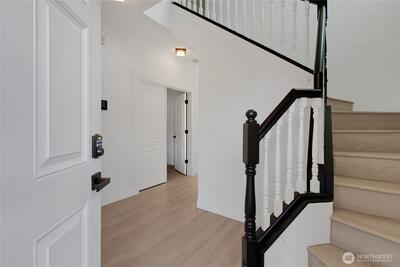 Beautiful former model home in the desirable East Pointe community of Bonney Lake with low HOA dues and thoughtful upgrades throughout. This spacious 1,881 sq ft townhouse offers 4 bedrooms and 2.5 baths, combining comfort, functionality, and style. The main level features durable laminate flooring, a versatile office/bonus room, and a convenient half bath. The open kitchen is designed to impress with quartz countertops, a full-height tile backsplash, stainless steel appliances, and a pantry for added storage.Enjoy year-round comfort with air conditioning and a cozy gas fireplace. Upstairs, the generous primary suite includes an extra-large walk-in closet, ceiling fan, and a private en-suite bath with a soaking tub and separate shower—perfect for relaxing at the end of the day.Additional highlights include wiring for surround sound and security, a fully fenced corner lot, and low-maintenance living with the HOA covering front yard care and irrigation. Ample parking is a bonus with a