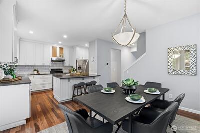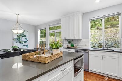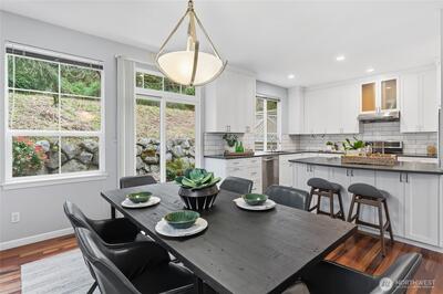 Featuring 1,864 sq. ft. of spacious living space and a 2-car attached garage, this updated 4-bedroom, 2.5-bath home overlooks a private, serene greenbelt and truly lives like a single-family residence. Located in the sought-after Summerhill community, this south-facing end-unit boasts three sides of windows, maximizing natural light and airflow throughout the high-ceilinged, freshly painted interior. The living room highlights upgraded Tigerwood hardwood flooring, a cozy gas fireplace, and gorgeous views of Tiger Mountain. At the heart of the home, the open-concept, updated kitchen shines with quartz countertops, stainless steel appliances, and custom soft-close cabinetry. Retreat to the primary suite, which includes a generous walk-in closet and a double-sink vanity. Outside, the private patio is the perfect tranquil oasis for sipping your morning coffee or hosting summer BBQs.