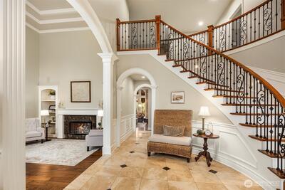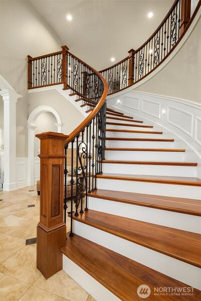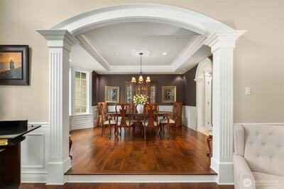 Magnificent 6,900 sq ft estate on 4.5 pristine acres within Cornerstone, Maple Valley's most exclusive gated community. This exceptional home blends refined craftsmanship with resort-style living. Grand two-story foyer with circular wrought-iron staircase, heated travertine floors, extensive millwork, and formal living spaces set an elevated tone.Prepare gourmet meals in your recently remodeled kitchen featuring white cabinetry, 6 burner stove & large quartzite island while enjoying the thoughtful elements including built-in ice maker, butler's pantry & appliance garage. Enjoy the dining & living room areas w/ floor to ceiling windows overlooking your truly special backyard oasis: This resort-style space w/swimming pool, hot tub, multiple entertaining patios, covered outdoor kitchen w/wood-burning fireplace, manicured putting green, and versatile sport court. After a day of play, retreat each evening to the main-floor primary suite w/a private patio, gas fireplace with carved stone man