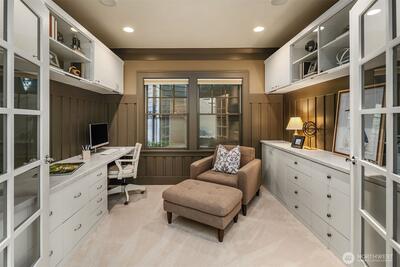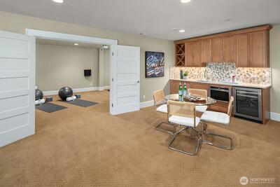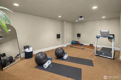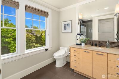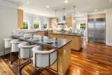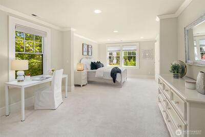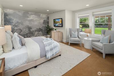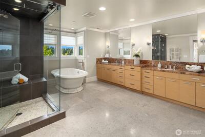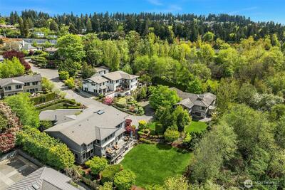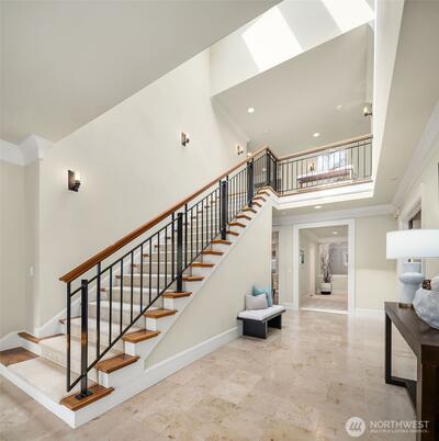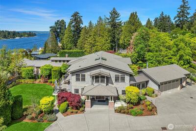 At the end of a quiet cul-de-sac, nestled between Wetherill Nature Preserve and Cozy Cove, this exceptional Yarrow Point home offers privacy, lake views, and seamless indoor-outdoor living. The main level features formal living and dining rooms opening to a private courtyard, an inviting family room, and a sunlit breakfast area adjoining the chef’s kitchen overlooking the grounds, and dedicated home office. Thoughtfully designed mudroom with built-in storage, dog wash, and powder bath connects to the 3-car garage. Upstairs offers four bedrooms each with ensuite bathrooms and custom closets, including a luxurious primary suite with dual walk-in closets and serene lake views, plus convenient upper-level laundry. The lower level lives like a private retreat with flexible entertainment space for home theater, gym, music or craft room, plus a sauna, and a fifth guest ensuite with adjacent living area and generous kitchenette — ideal for entertaining, extended stays or multigeneration